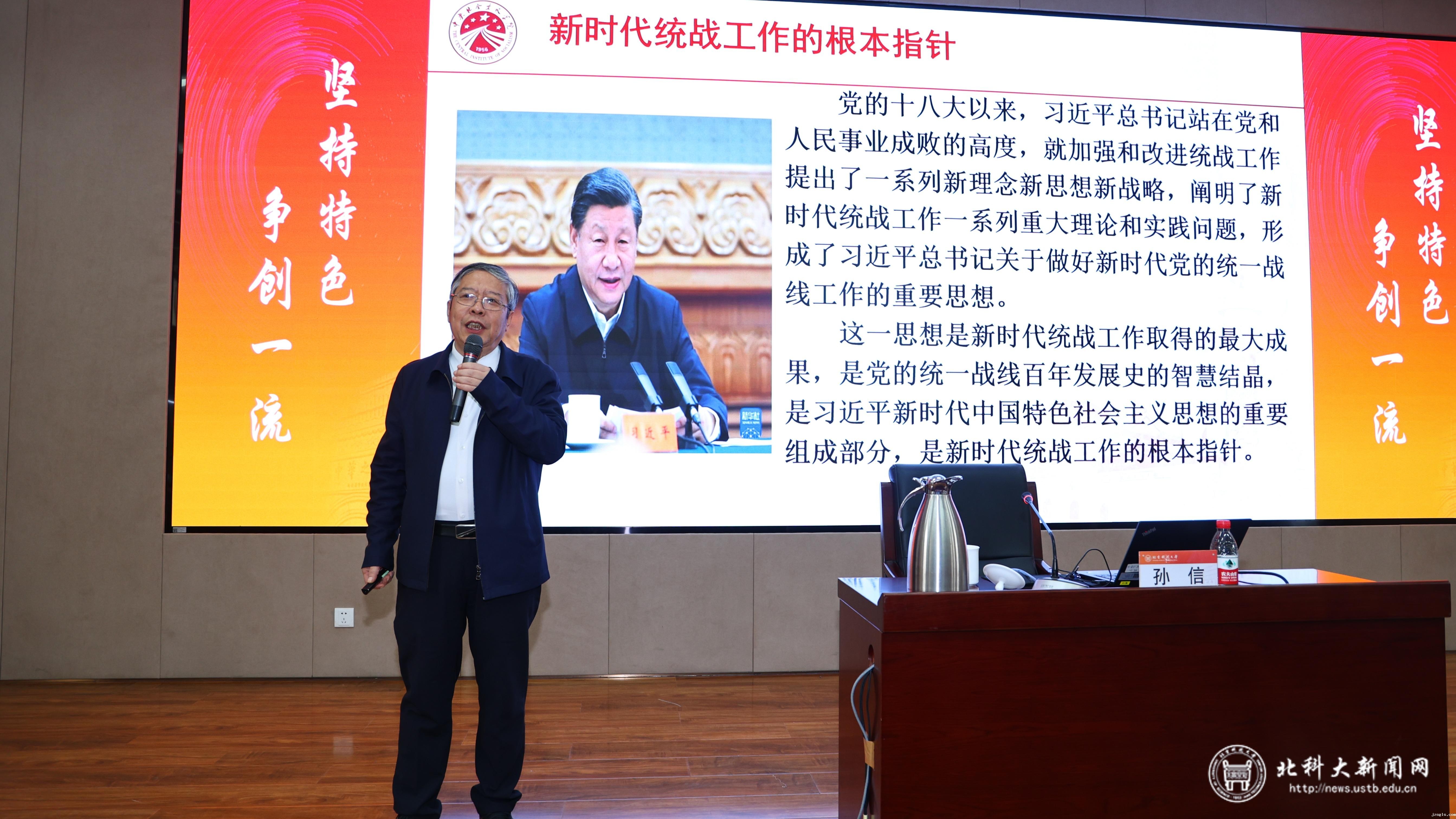孙信从新时代爱国统一战线的历史方位、习近平总书记关于做好新时代党的统一战线工作的重要思想的主要内容、促进中华儿女大团结是新时代爱国统一战线的历史责任3个方面作了生动阐述。他讲到,统一战线在我国革命、建设、改革的不同历史时期发挥了重要作用,世界百年未有之大变局加速演进,统一战线在维护国家主权、安全、发展利益上的作用更加重要;全面建设社会主义现代化国家、实现中华民族伟大复兴,统一战线在围绕中心、服务大局上的作用更加重要;我国社会结构发生深刻变化,统一战线在增强党的阶级基础、扩大党的群众基础上的作用更加重要。他指出,统一战线因团结而生,靠团结而兴,促进中华儿女大团结,是新时代爱国统一战线的历史责任。习近平总书记就统战工作提出了一系列新理念、新思想、新战略,要切实理解好、宣传好、贯彻好习近平总书记关于做好新时代党的统一战线工作的重要思想,加强思想政治引领,广泛凝聚共识,努力寻求最大公约数、画出最大同心圆。