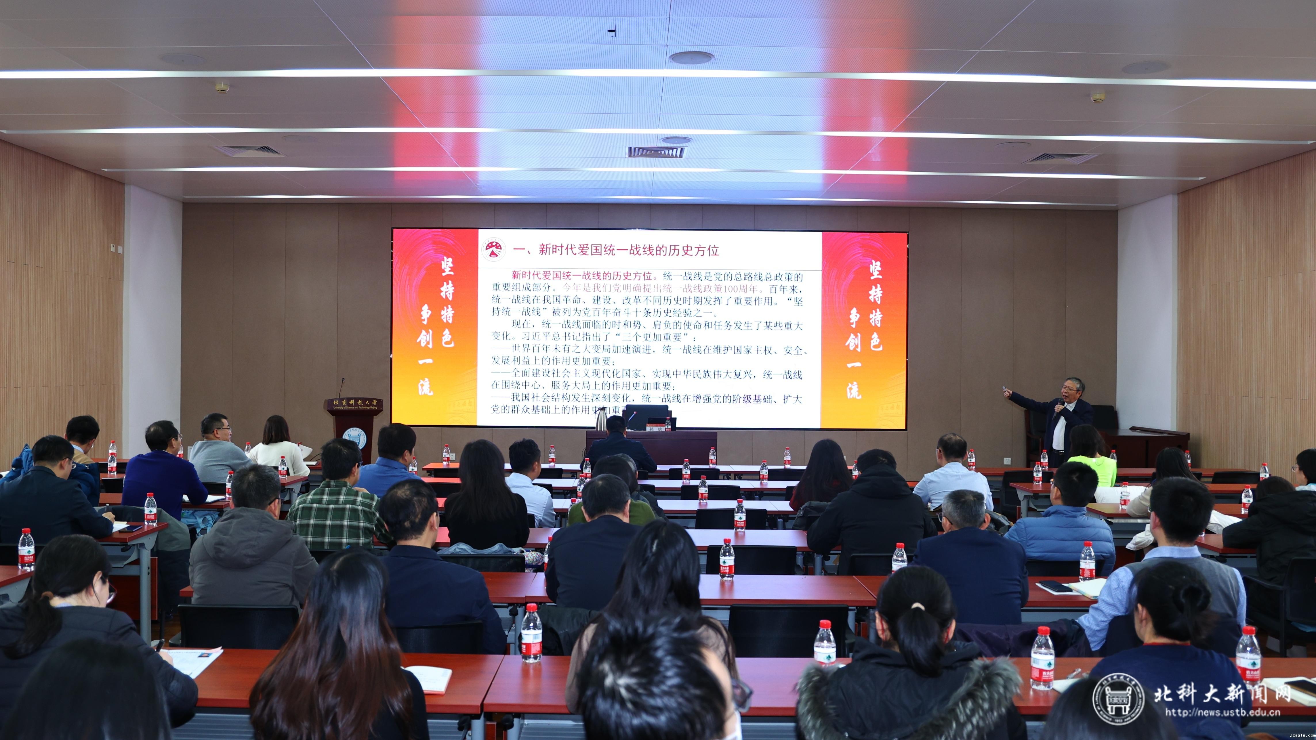 为深入学习贯彻习近平总书记关于做好新时代党的统一战线工作的重要思想,不断完善发展大统战工作格局,12月12日,党委统战部举办统一战线“同心讲堂”第三讲,邀请中央社会主义学院统战教研部原主任孙信教授作题为《学习习近平总书记关于做好新时代党的统一战线工作的重要思想》的专题讲座。学校各民主党派、统战团体成员,各单位党委书记、党委秘书参加学习,党委宣传部、教师工作部、学生工作部、校友会等相关部门领导受邀参加,讲堂由党委常委、统战部部长、财务处处长曹光远主持。
