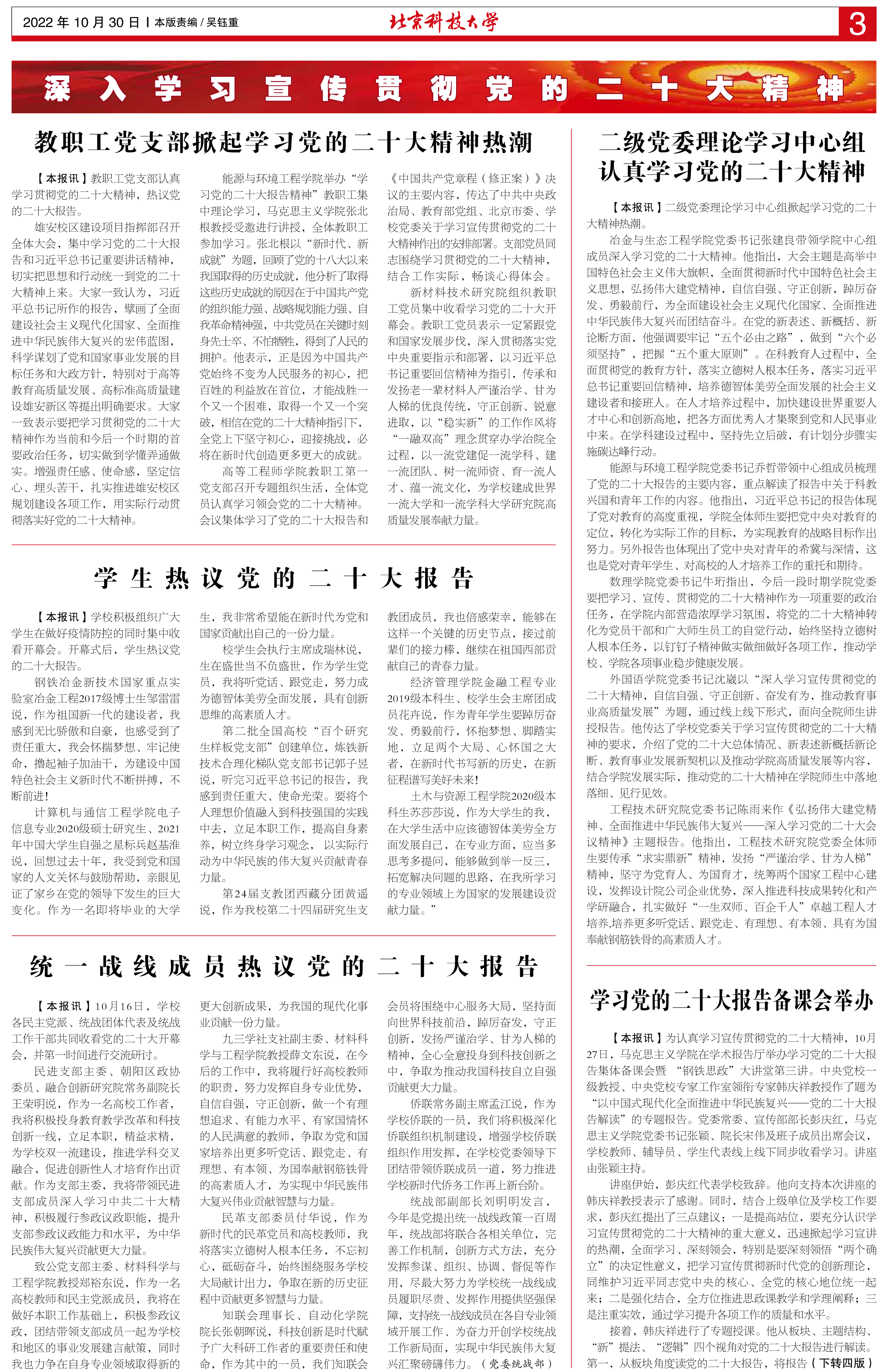 二级党委理论学习中心组掀起学习党的二十大精神热潮。冶金与生态工程学院党委书记张建良带领学院中心组成员深入学习党的二十大精神。他指出,大会主题是高举中国特色社会主义伟大旗帜,全面贯彻新时代中国特色社... -