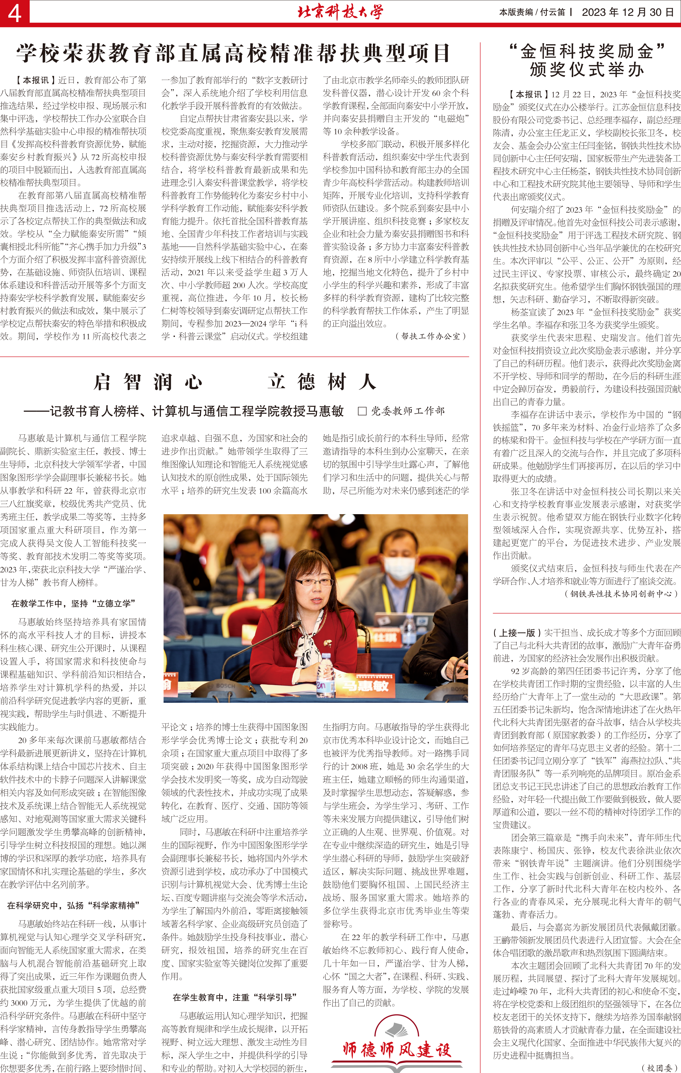12月22日,2023年“金恒科技奖励金”颁奖仪式在办公楼举行。江苏金恒信息科技股份有限公司党委书记、总经理李福存,副总经理陈清,办公室主任龙正义,学校副校长张卫冬,校友会、基金会办公室主任闫奎铭,钢铁共...