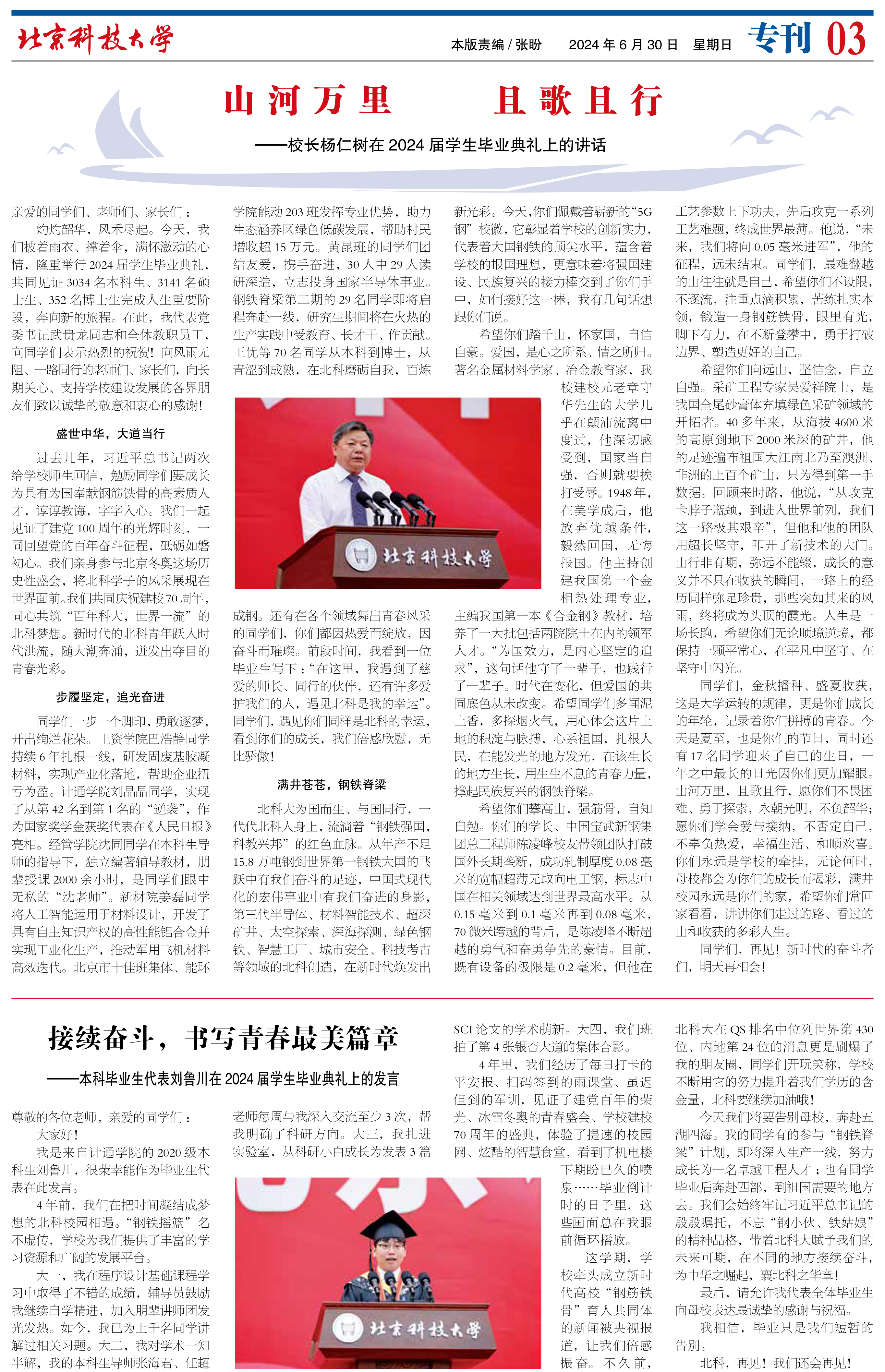 亲爱的同学们、老师们、家长们:灼灼韶华,风禾尽起。今天,我们披着雨衣、撑着伞,满怀激动的心情,隆重举行2024届学生毕业典礼,共同见证3034名本科生、3141名硕士生、352名博士生完成人生重要阶段,奔向新的旅...